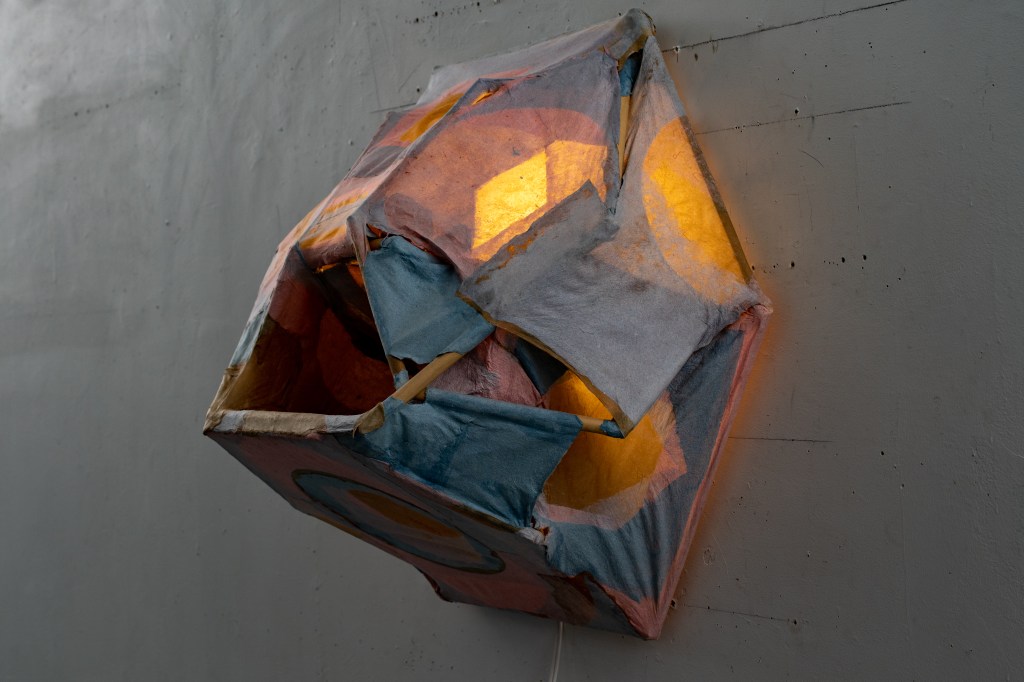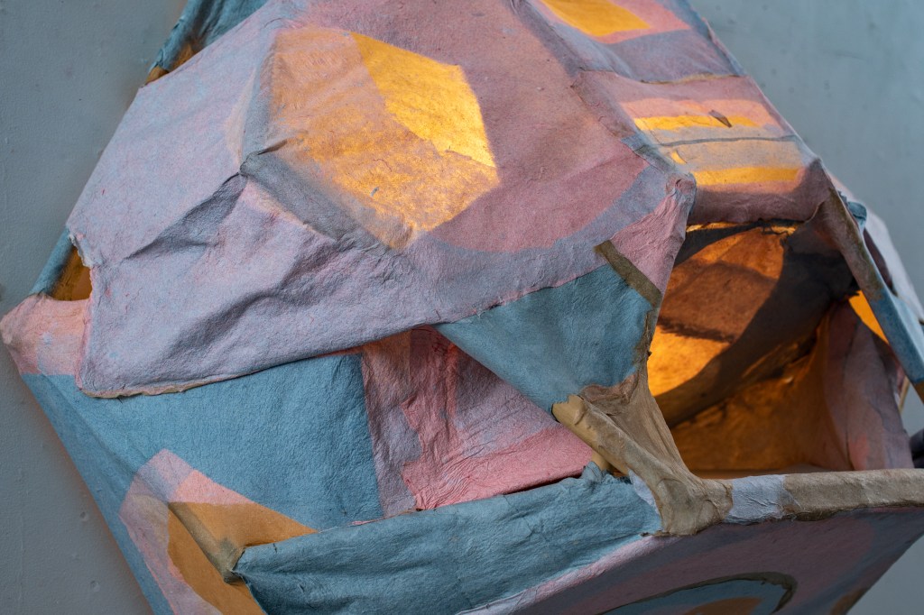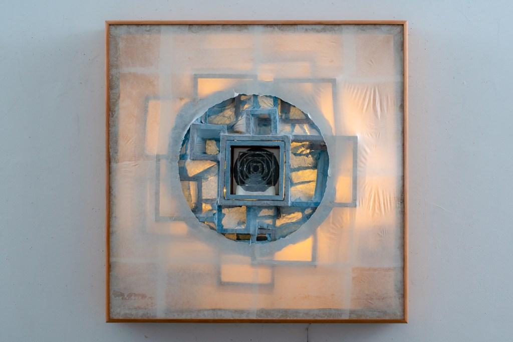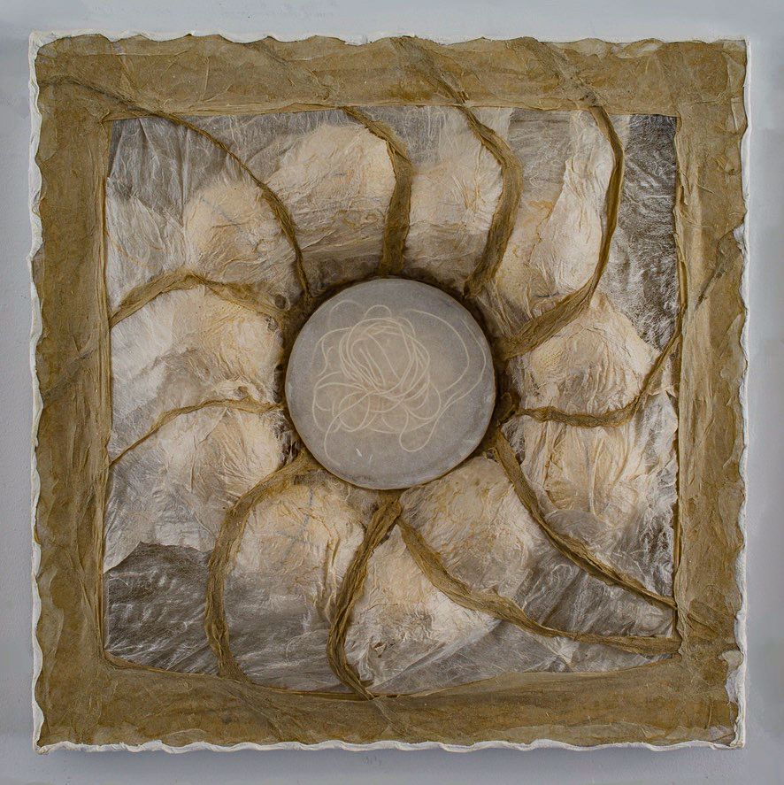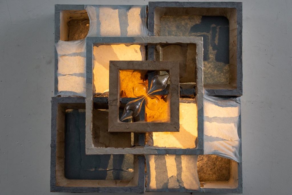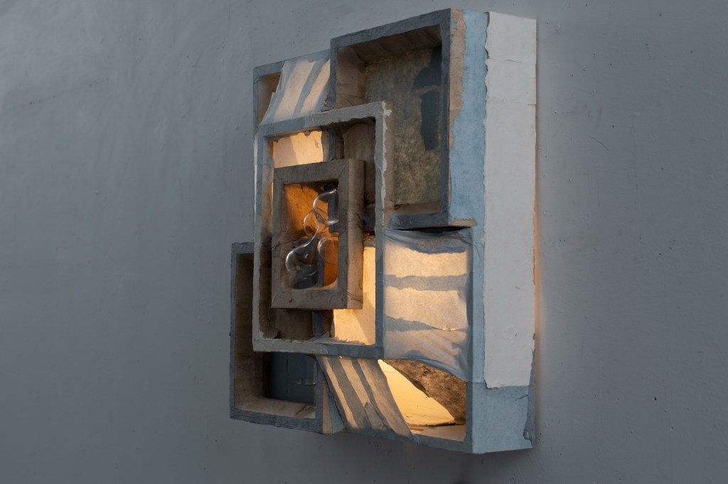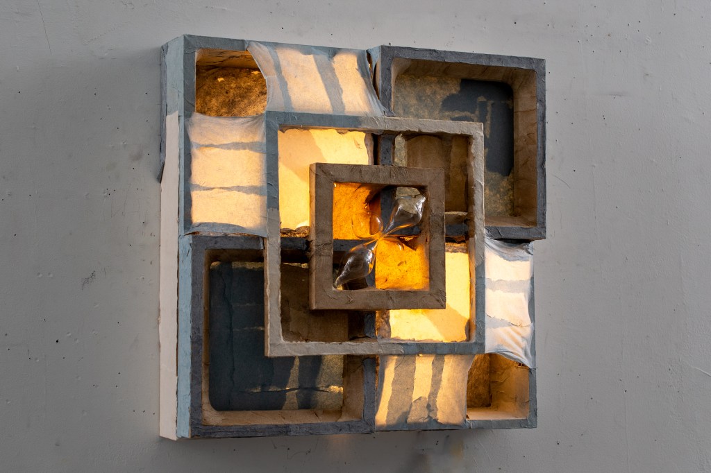 Handmade paper (made from the artists clothing), glass, mirror, and wood