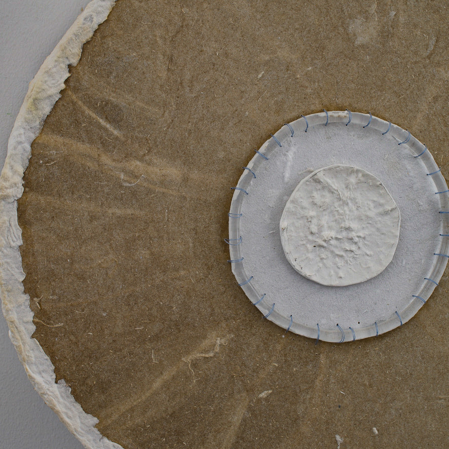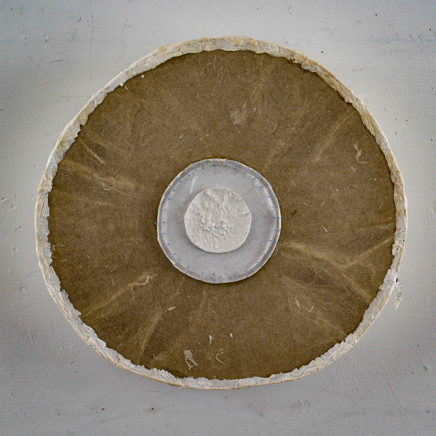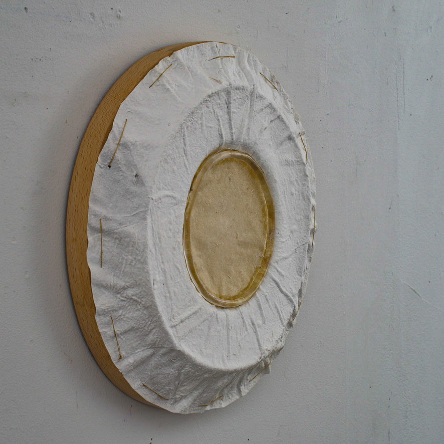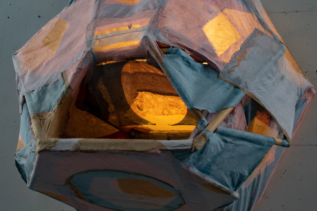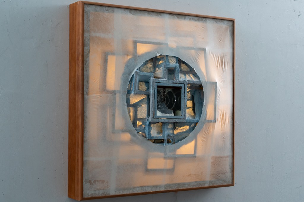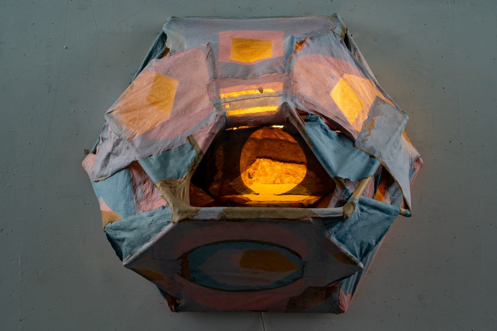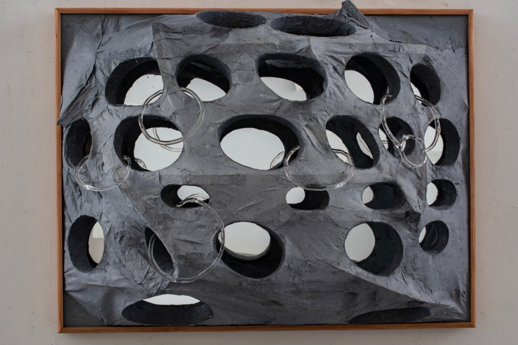 Handmade paper (made from the artists clothing), glass, mirror, and wood