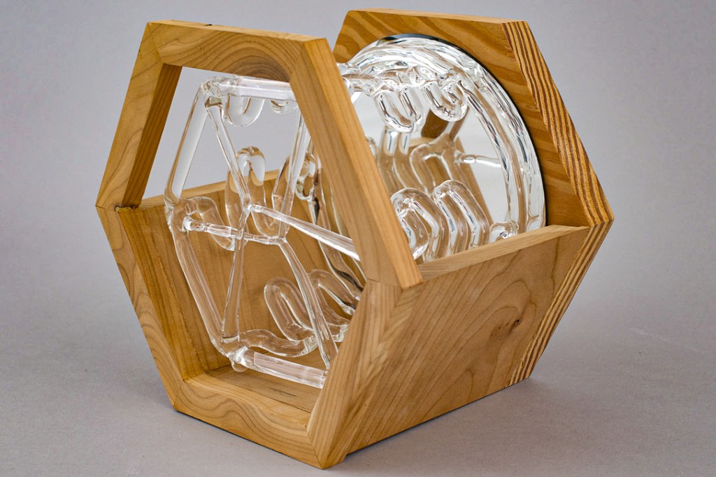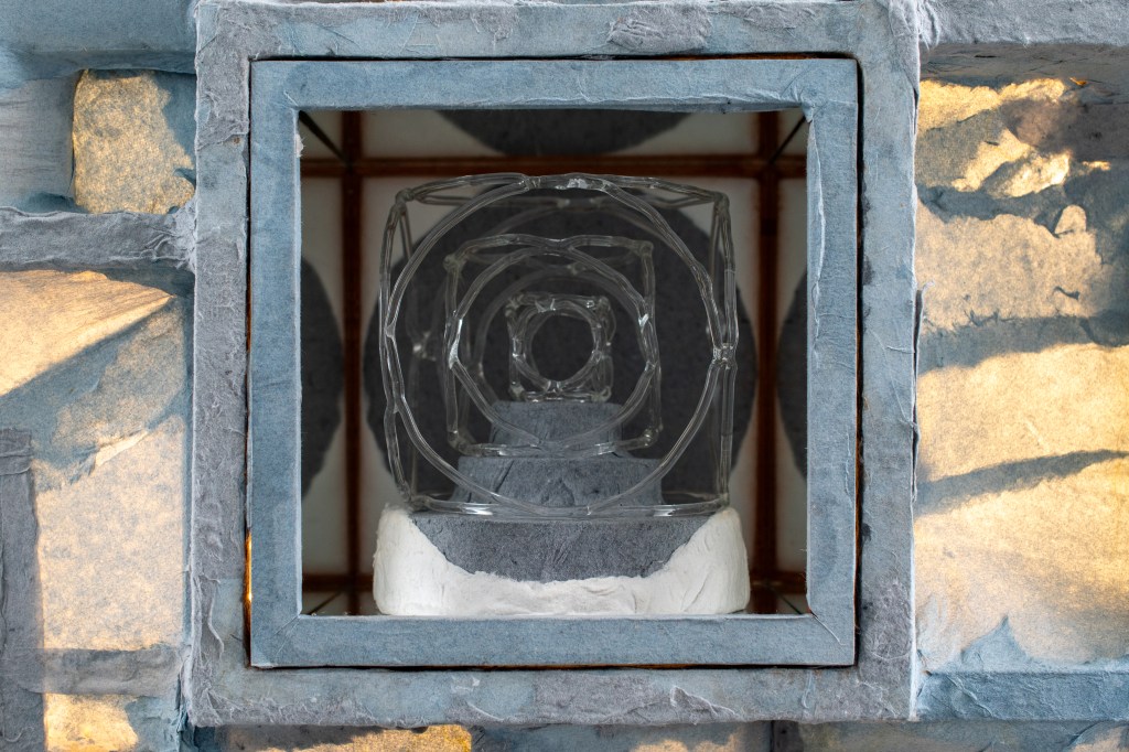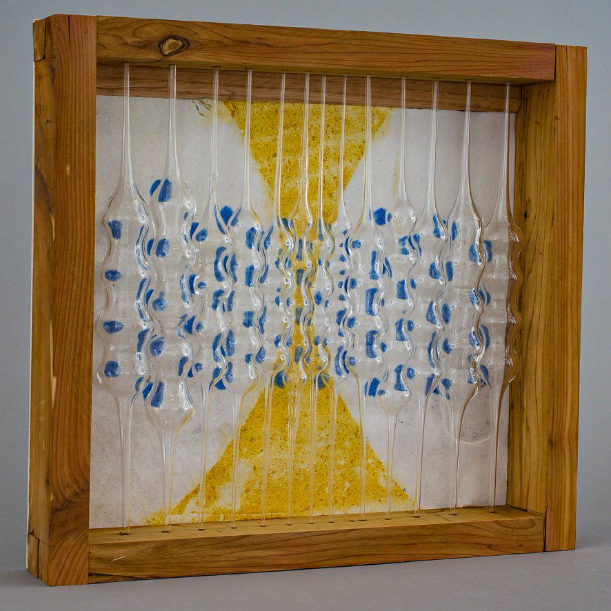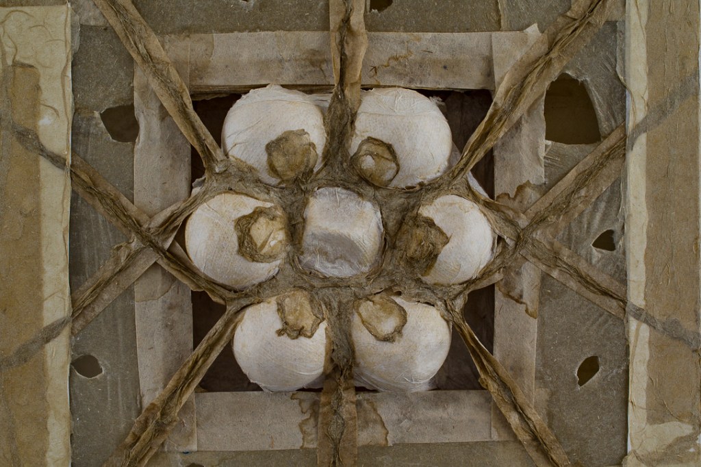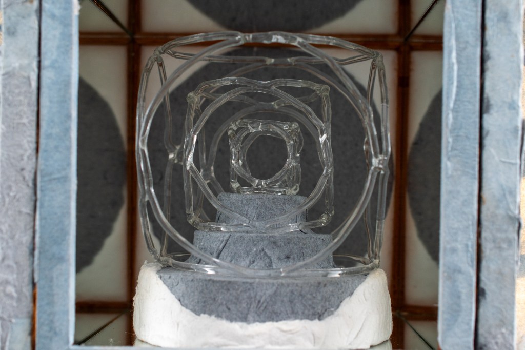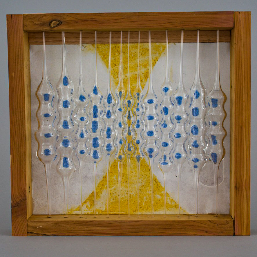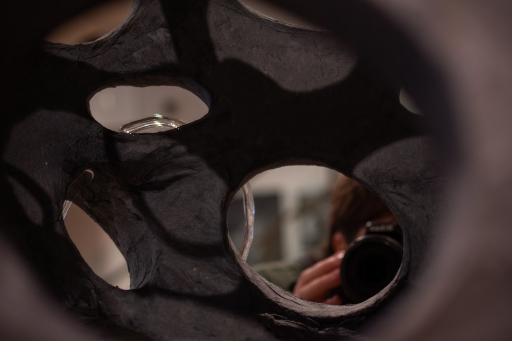 Handmade paper (made from the artists clothing), glass, mirror, and wood